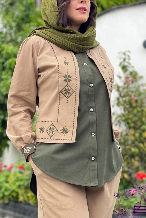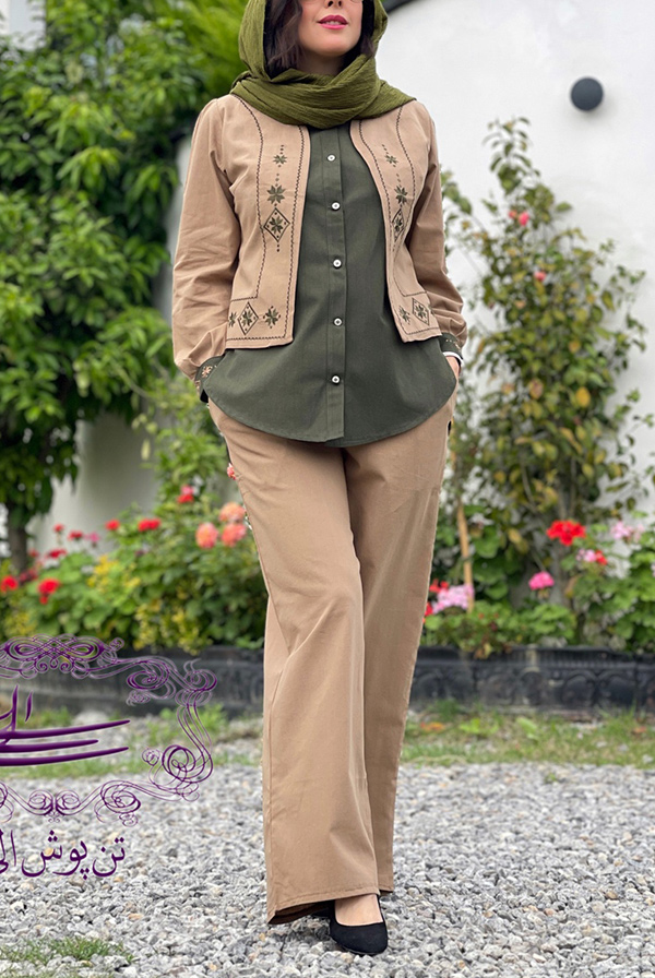 سه تیکه کت کوتاه - شومیز دکمه دار آستین حلقه ای - شلوار تمام کش